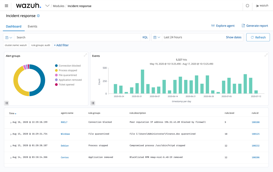 Wazuh is a free and open source platform used for threat prevention, detection, and response. It is capable of protecting workloads across on-premises, virtualized, containerized, and cloud-based environments.